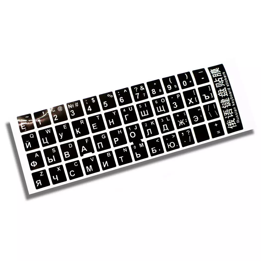 Наклейки на клавіатуру чорного кольору з білими літерами призначені для зручності використання клавіатури з можливістю перемикання між російською та англійською мовами.
