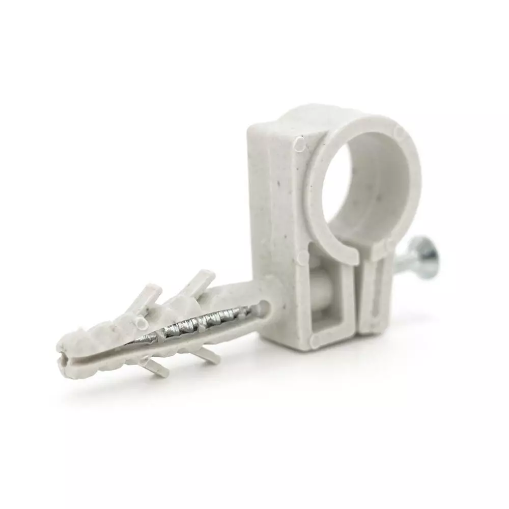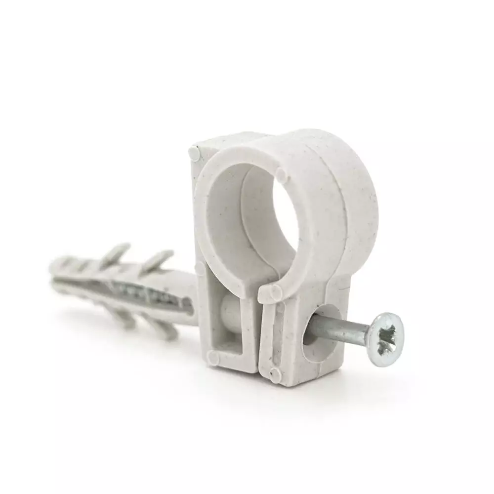 Дюбель з розпірними зубцями для надійного кріплення в будь-якому матеріалі стіни, стелі. Після розклинювання дюбеля ударним шурупом (входить до комплекту) замок-фіксатор забезпечує довге та якісне утримання труб у пластиковій обоймі. Щоб витягнути виріб, необхідно викрутити шуруп та повністю демонтувати елемент. Обойма є роз'ємною.