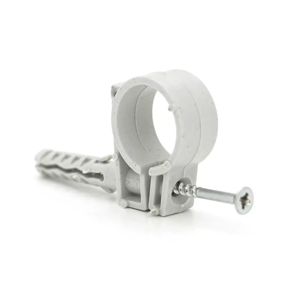 Дюбель з розпірними зубцями для надійного кріплення в будь-якому матеріалі стіни, стелі. Після розклинювання дюбеля ударним шурупом (входить до комплекту) замок-фіксатор забезпечує довге та якісне утримання труб у пластиковій обоймі. Щоб витягти виріб, необхідно викрутити шуруп та повністю демонтувати елемент. Обойма є роз'ємною.