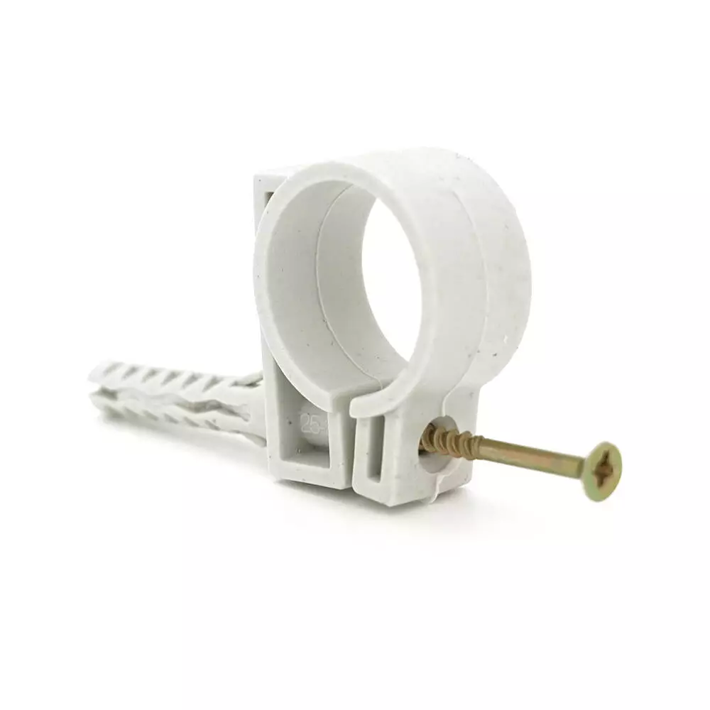 Дюбель з розпірними зубцями для надійного кріплення в будь-якому матеріалі стіни, стелі. Після розклинювання дюбеля ударним шурупом (входить до комплекту) замок-фіксатор забезпечує довге та якісне утримання труб у пластиковій обоймі. Щоб витягти виріб, необхідно викрутити шуруп та повністю демонтувати елемент. Обойма є роз'ємною.