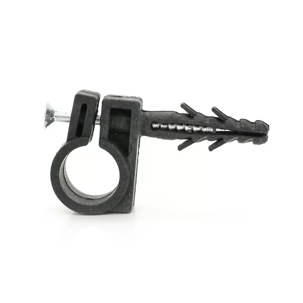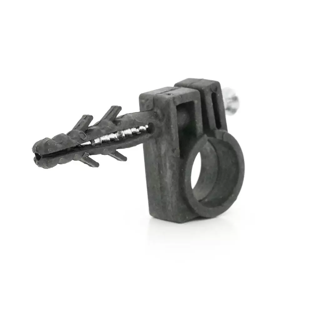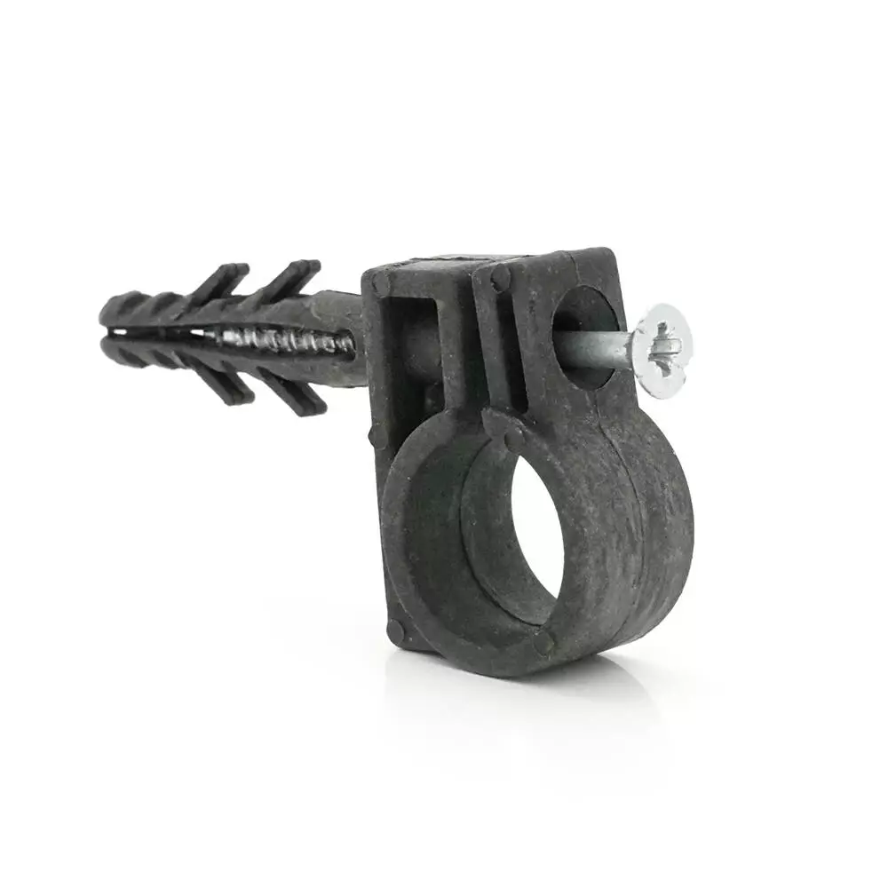 Дюбель з розпірними зубцями для надійного кріплення в будь-якому матеріалі стіни, стелі. Після розклинювання дюбеля ударним шурупом (входить до комплекту) замок-фіксатор забезпечує довге та якісне утримання труб у пластиковій обоймі. Щоб витягнути виріб, необхідно викрутити шуруп та повністю демонтувати елемент. Обойма є роз'ємною.