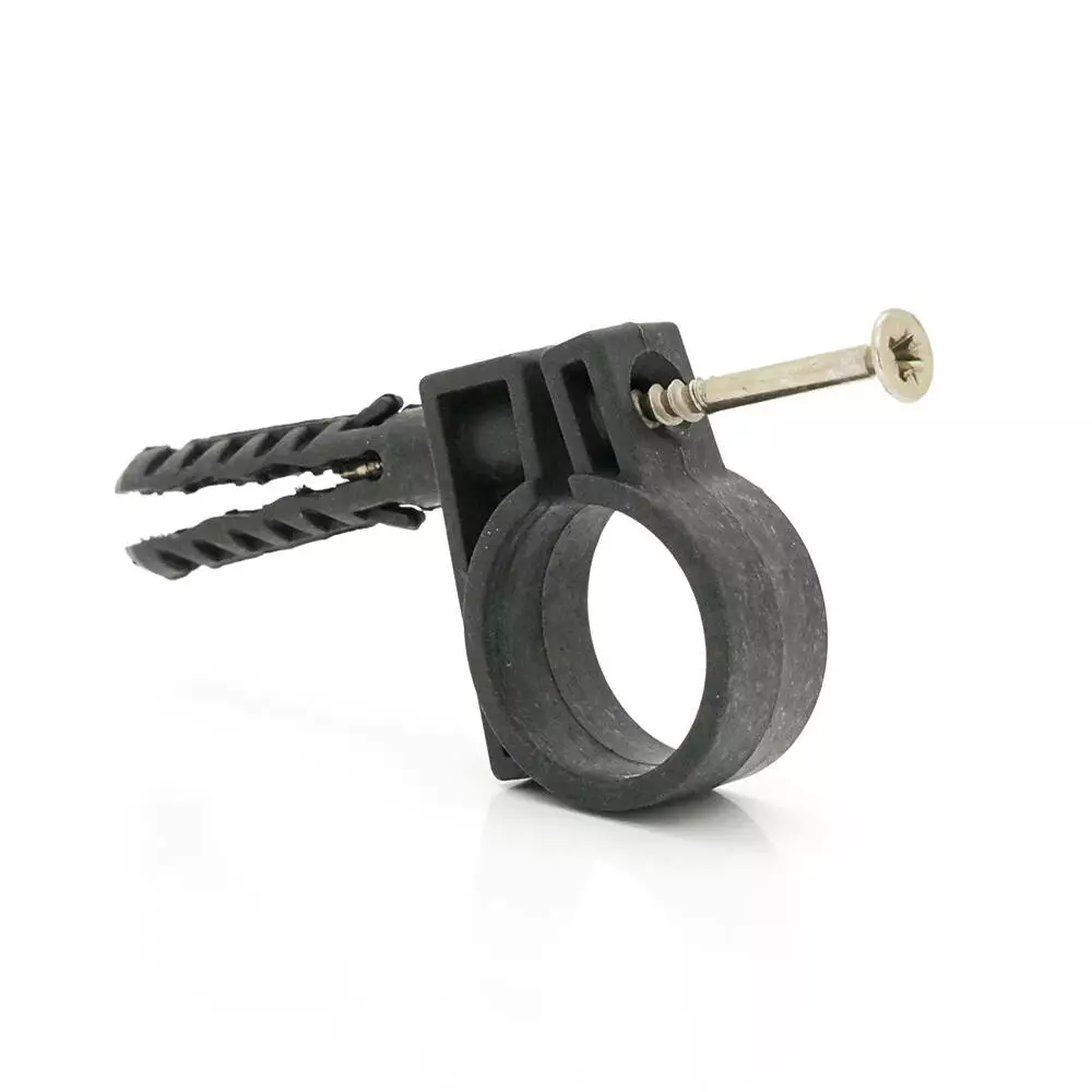 Дюбель з розпірними зубцями для надійного кріплення в будь-якому матеріалі стіни, стелі. Після розклинювання дюбеля ударним шурупом (входить до комплекту) замок-фіксатор забезпечує довге та якісне утримання труб у пластиковій обоймі. Щоб витягти виріб, необхідно викрутити шуруп та повністю демонтувати елемент. Обойма є роз'ємною.