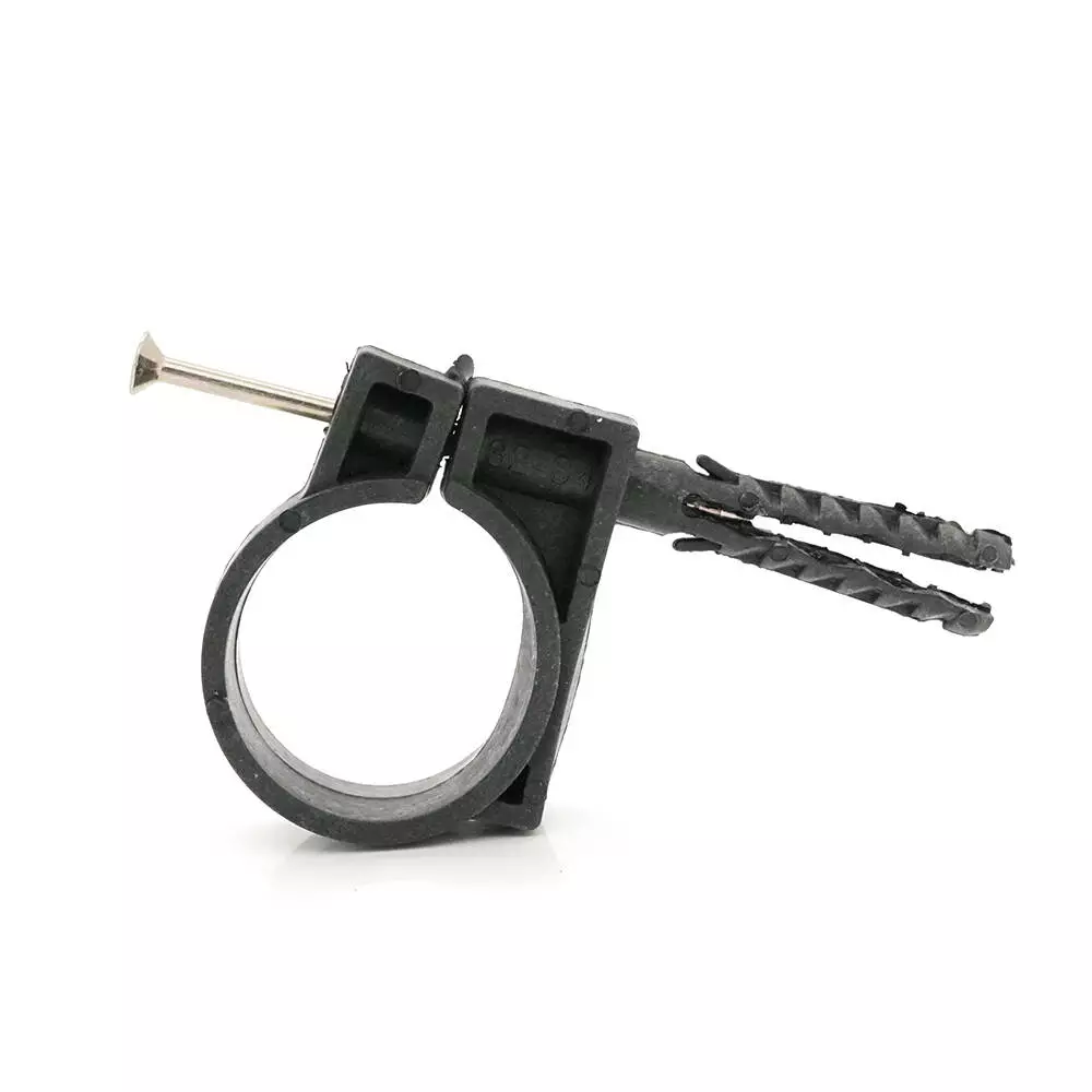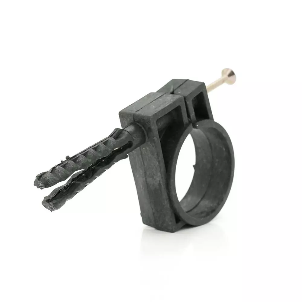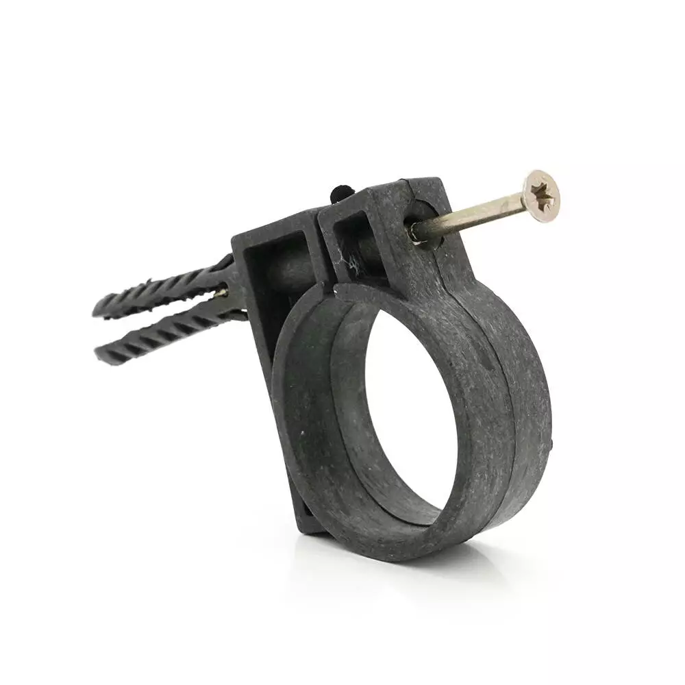 Дюбель з розпірними зубцями для надійного кріплення в будь-якому матеріалі стіни, стелі. Після розклинювання дюбеля ударним шурупом (входить до комплекту) замок-фіксатор забезпечує довге та якісне утримання труб у пластиковій обоймі. Щоб витягти виріб, необхідно викрутити шуруп та повністю демонтувати елемент. Обойма є роз'ємною.
