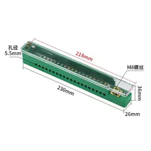 Паралельний розгалужувач-спліттер проводів FJ6/JHD-1-20, 1фаза-1вхід М8, 20 виходу (латунь) 1,5-35х1,5-16мм2, AC600V, 60А, -55°С~125°С, 234*37*30мм,GREEN