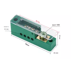Паралельний розгалужувач-спліттер проводів FJ6/JHD-1-4, 1фаза-1вхід М8, 4 виходів(латунь)1,5-35х1,5-10мм2, AC600V, 60А, -55°С~125°С, 87*30*21мм,GREEN