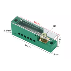 Паралельний розгалужувач-спліттер проводів FJ6/JHD-1-6, 1-фаза-1вхід М8, 6виходів(латунь)1,5-35х1,5-10мм2, AC600V, 60А,-55°С~125°С,103*37*24мм,GREEN