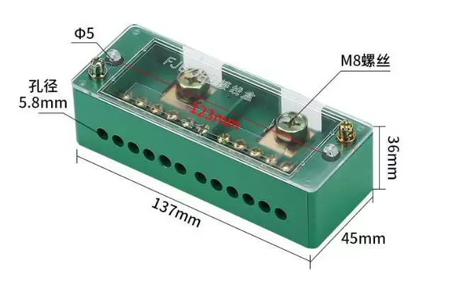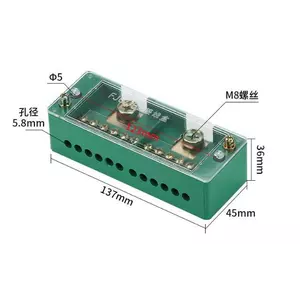 Паралельний розгалужувач-сплиттер проводів FJ6/JHD-2-12,1фаза-2 вхід М8, 12 виходу (латунь) 1,5-35х1,5-16мм2, AC600V, 60А, -55°С~125°С, 121*32*45мм,GREEN