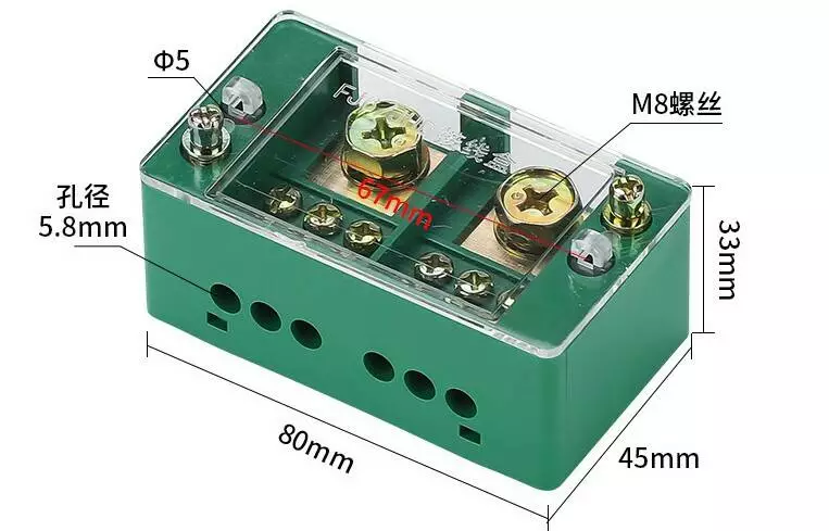 Паралельний розгалужувач-спліттер проводів FJ6/JHD-2-6, 1фаза-2вхід М8, 6 виходу(латунь)1,5-35х1,5-16мм2, AC600V,60А, -55°С~125°С, 80*33*45мм,GREEN