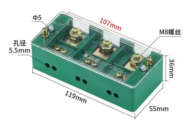 Паралельний розгалужувач-спліттер проводів FJ6/JHD-3-6, 1фаза-3вхід М8, 6 виходу (латунь) 1,5-35х1,5-16мм2, AC600V, 60А, -55°С~125°С, 120*33*55мм,GREEN