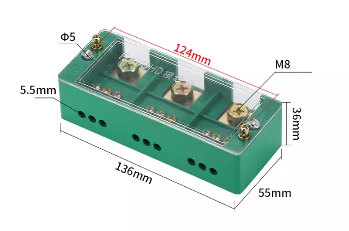 Паралельний розгалужувач-сплиттер проводів FJ6/JHD-3-9,1фаза-3-вхід М8, 9виходів(латунь) 1,5-35х1,5-16мм2, AC600V, 60А,-55°С~125°С, 136*55*36мм,GREEN