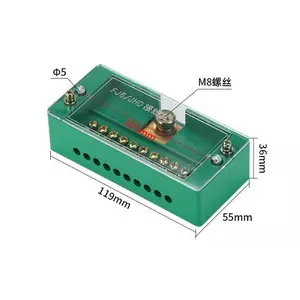 Паралельний розгалужувач-спліттер проводів JHD-1-10, 1фаза-1вхід М8, 10 виходу (латунь) 1,5-35х1,5-16мм2, AC600V, 60А, -55°С~125°С, 138*37*24мм,GREEN