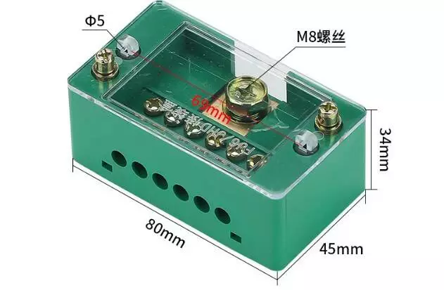 Паралельний розгалужувач-спліттер проводів JHD-1-6, 1фаза-1вхід М8, 6 виходу (латунь) 1,5-35х1,5-16мм2, AC600V, 60А, -55°С~125°С, 80*34*45мм, GREEN