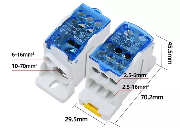 Паралельний розгалужувач-спліттер UKK160, 6 виходів (латунь) 6х16мм², вхід 1х70мм² + 1х16мм², AC/DC 1000V, 160А, 75*47*29,4 мм, BLUE
