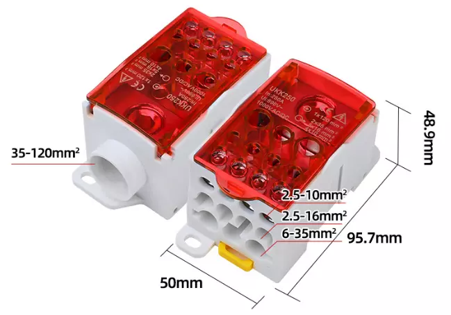 Паралельний розгалужувач-спліттер проводів UKK250, 11 виходів (латунь) 2х35мм+5х16мм+4х10мм, вхід 1х120мм, AC/DC 1000V, 250А, 95*50*50мм, RED
