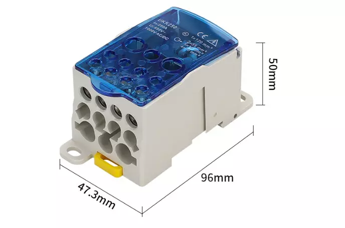 Паралельний розгалужувач-сплиттер проводів UKK400, 11 виходів (латунь) 2х35мм+5х16мм+4х10мм, вхід 1х120мм, AC/DC 1000V, 250А, 95*50*50мм, BLUE