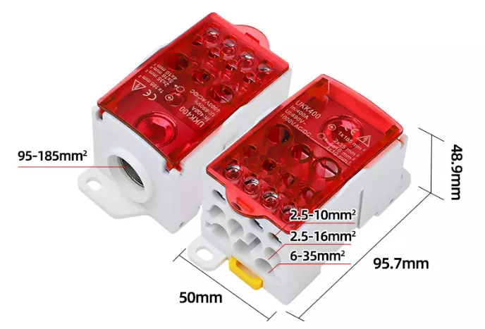 Паралельний розгалужувач-спліттер проводів UKK400, 11 виходів (латунь) 2х35мм+5х16мм+4х10мм, вхід 1х185мм, AC/DC 1000V, 400А, 95*50*50мм, RED