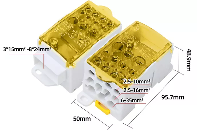 Паралельний розгалужувач-спліттер UKK500, 11 виходів (латунь) 2х35мм²+5х16мм²+4х10мм², вхід 3х15...8х24мм², AC/DC 1000V, 500А, 95*50*50мм, YELLOW