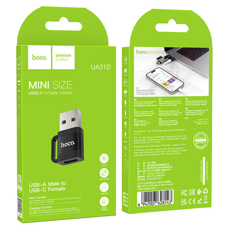 Перехідник HOCO UA31D USB2.0(M) => Type-C(F), Black, Box