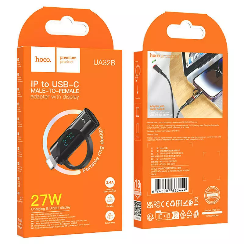 Перехідник HOCO UA32A Type-C(F) => Lighting(M), 60W, індикатор потужності заряду), Black, Box