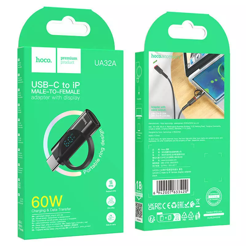 Перехідник HOCO UA32A Type-C(M) => Lighting(F), 60W, індикатор потужності заряду), Black, Box