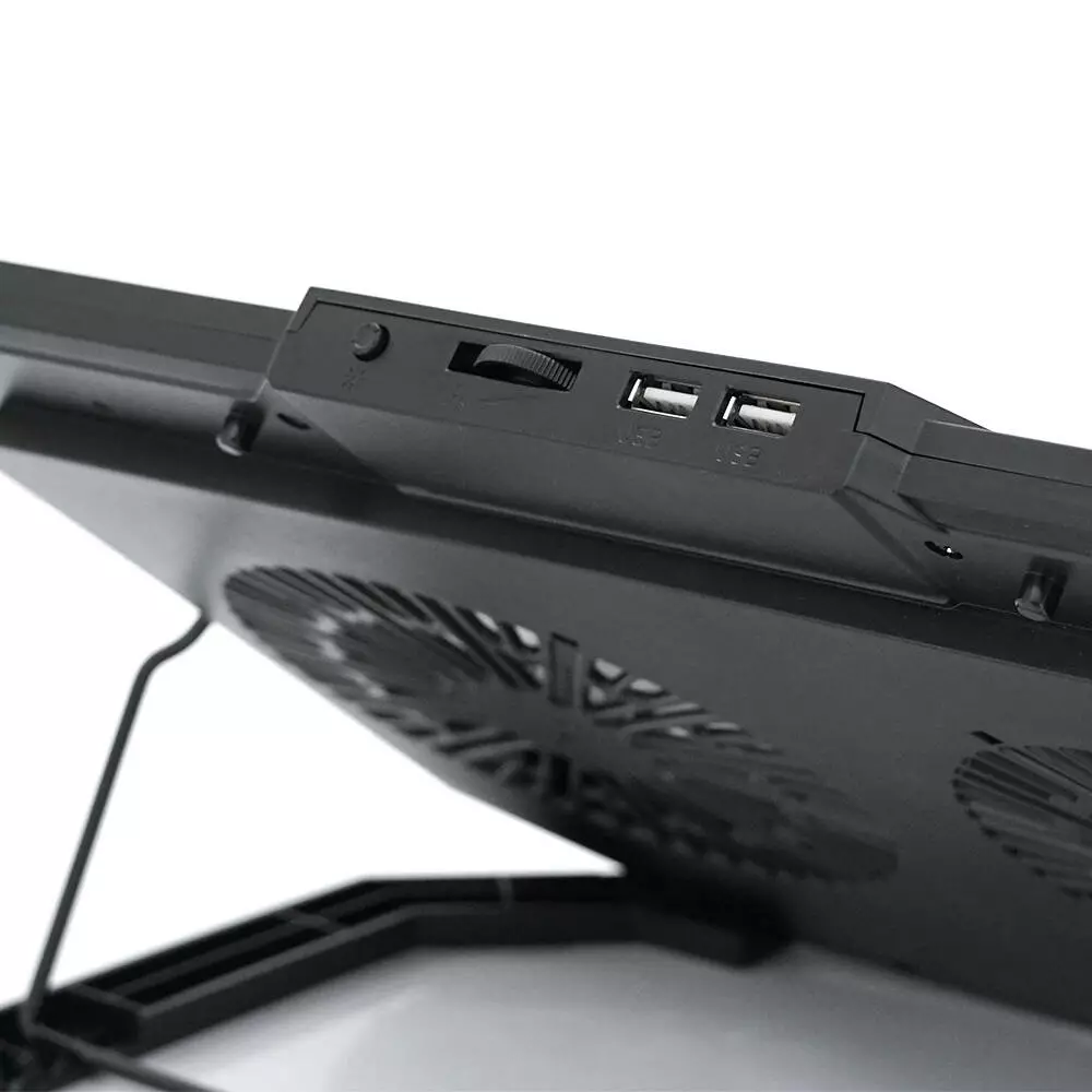В основі підставки - два великі вентилятори діаметром 125 мм, що працюють на швидкості 1200 оборотів за хвилину з можливістю регулювання швидкості. За допомогою двох USB-портів можна підключити додаткові пристрої, зберігаючи доступні порти вашого ноутбука.