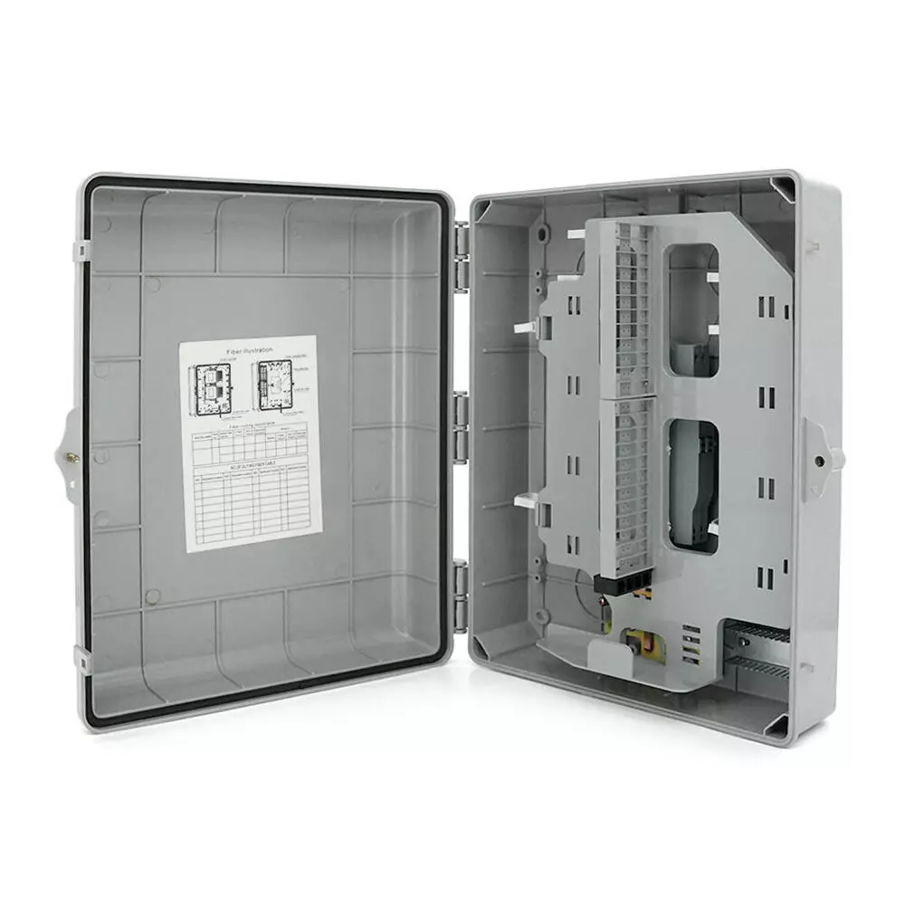 Коробка поєднує місткість та надійність, спрощуючи монтаж та обслуговування оптичних мереж. Підходить для монтажу на стінах або спеціалізованих шафах.