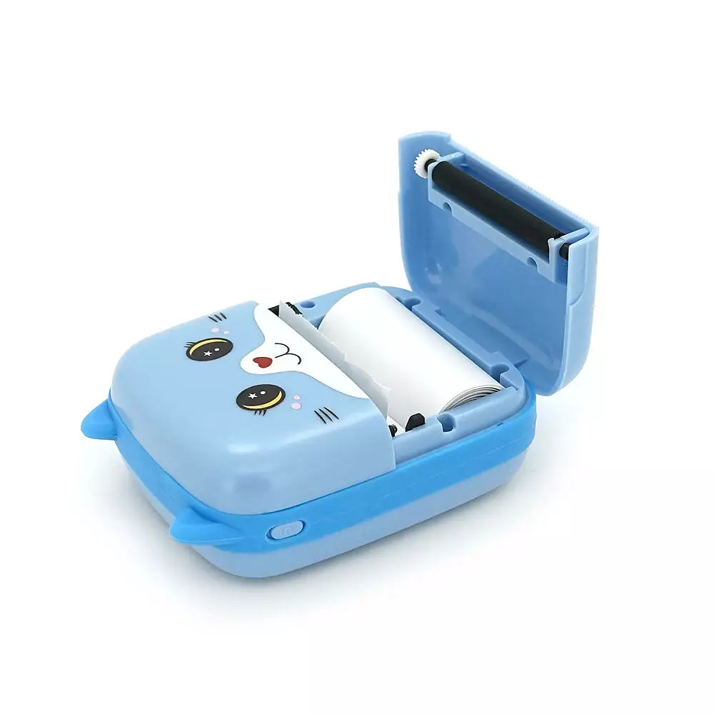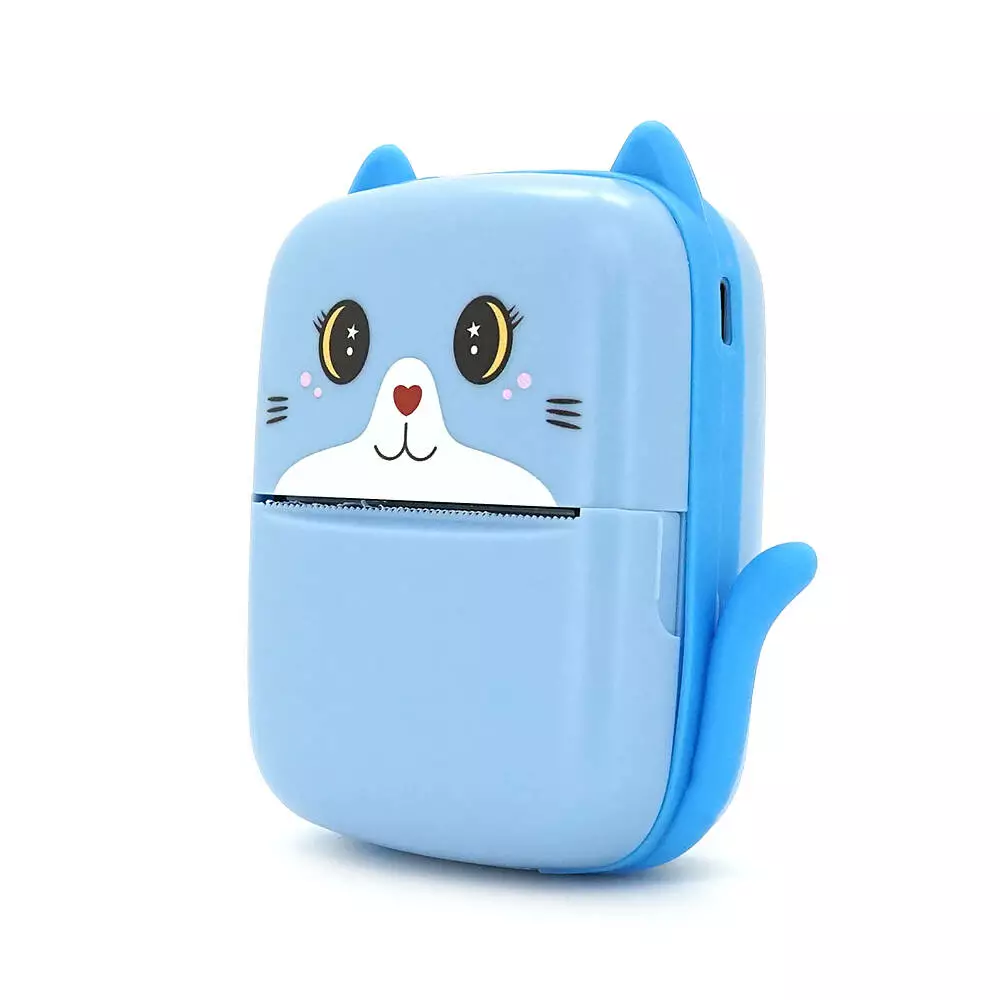 портативним дитячим термопринтером A8 Cat у блакитному кольорі. Цей