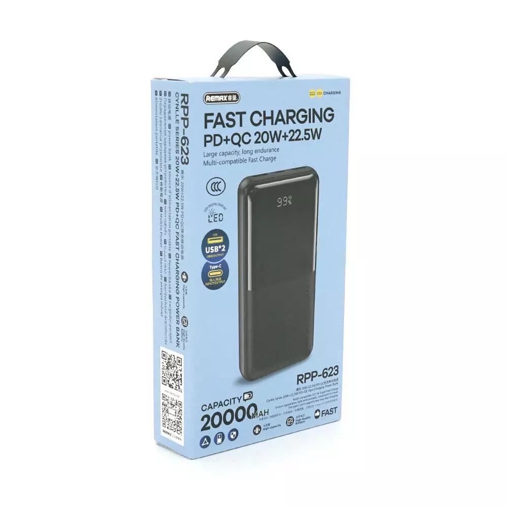 Power Bank Remax RPP-623 20000mAh, 2USB+Type-C, 22.5W, Black, 0.46kg