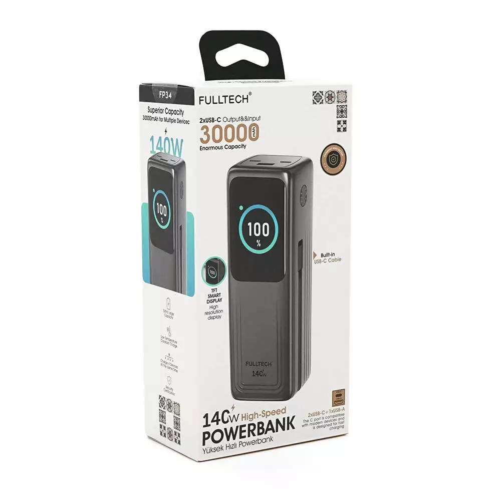 Powerbank Fulltech FP34 30000mAh, Fast charge PD140W, Li-pol, LCD Display, Вхід:Type-C, Виходи: 2xUSB Type-C, 1xUSB Type-A, USB Type-C Cable, Box