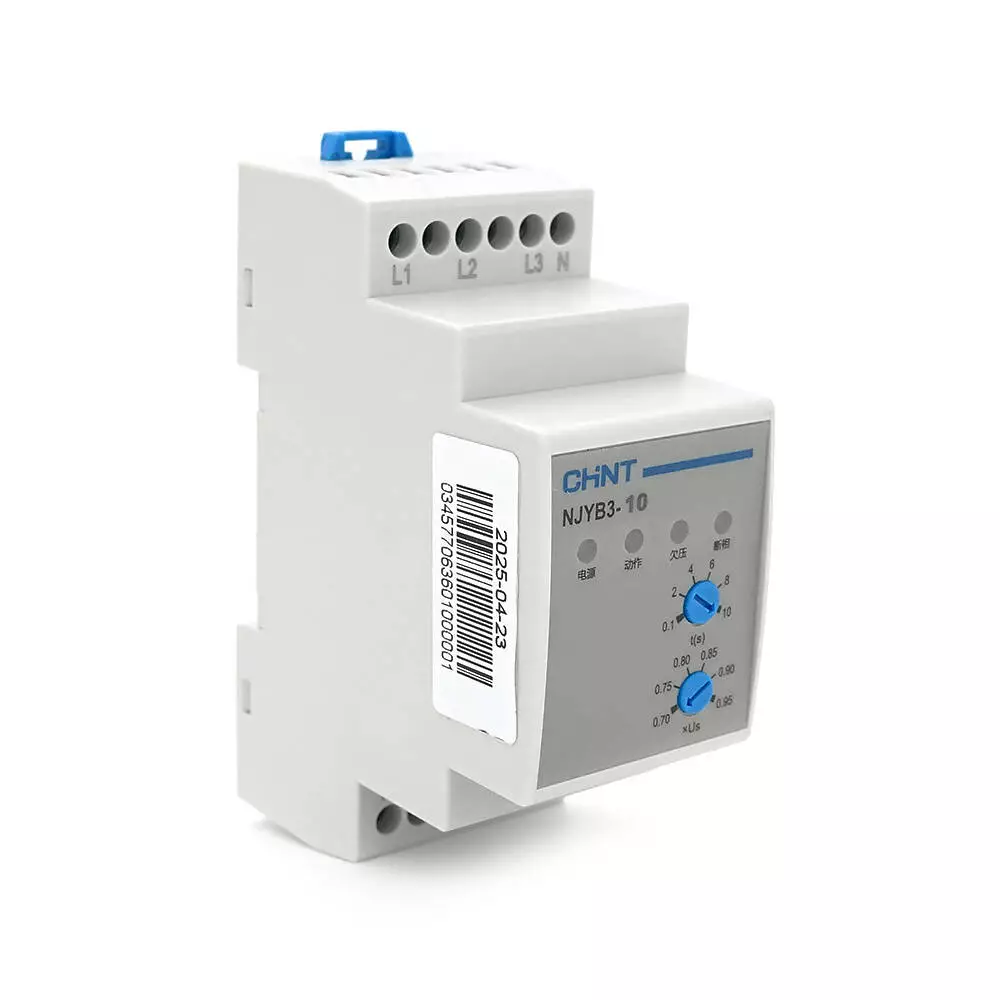 Реле контролю фаз CHINT NJYB3-10 AC220V, 1-2F4P, Захист U- (0,7~0,95) *Us, Затримка 0,1~10с, Захист обриву фаз, Ue240/415V, Ie0.75/0.47, 1CO+1NO