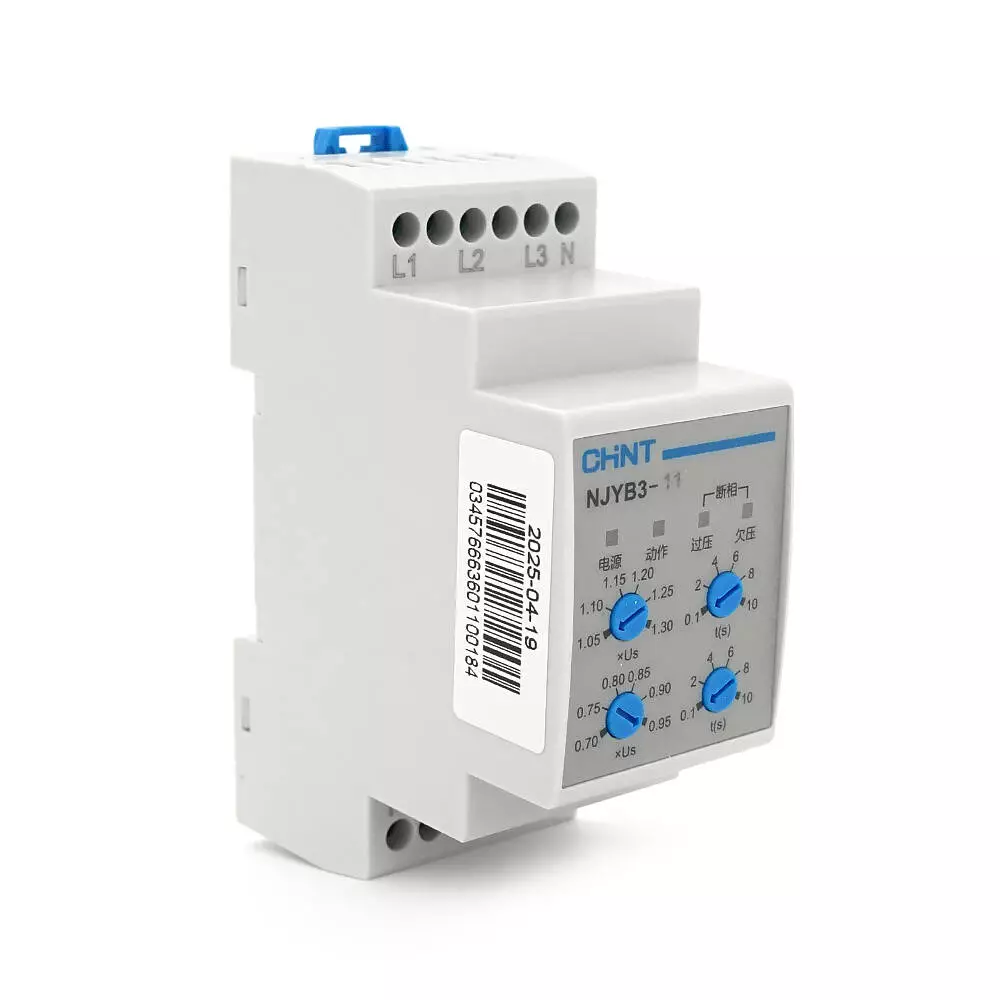 Реле контролю фаз CHINT NJYB3-11 AC220V, 1-2F4P, Захист U+(1,05~1,3)*Us/U-(0,7~0,95)*Us,Затримка 0,1~10с,Захист обриву фаз, Ue240/415V,Ie0.75/0.47, 1CO+1NO