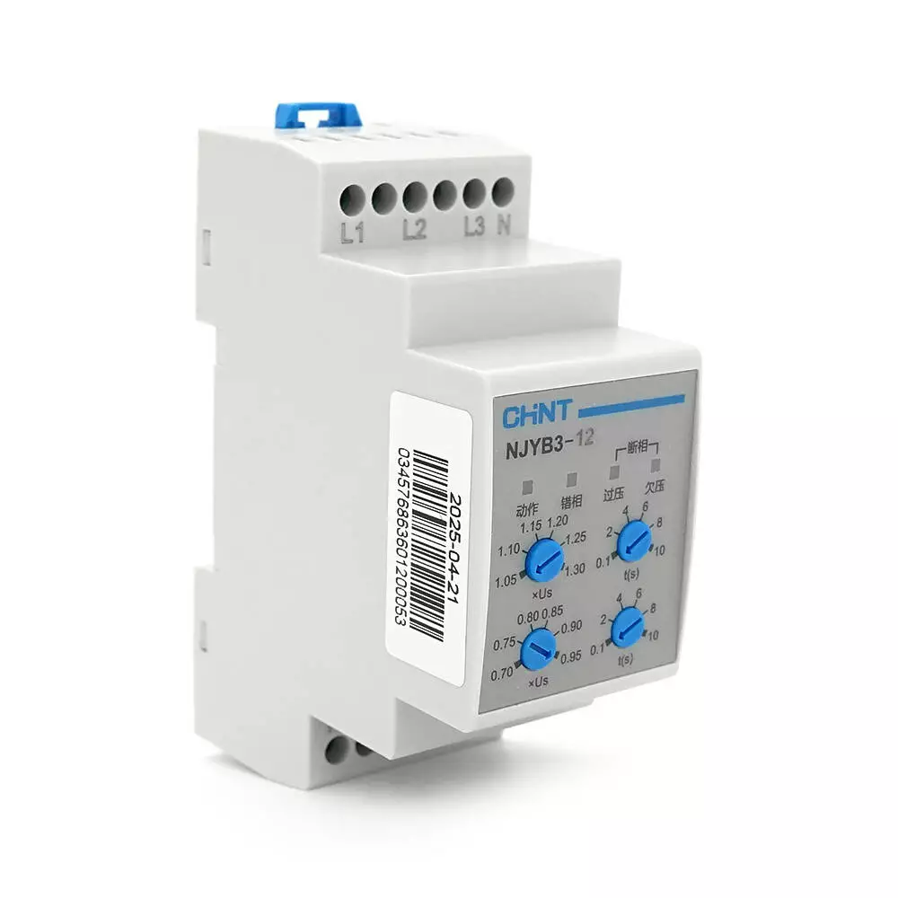 Реле контролю фаз CHINT NJYB3-12 AC220V, 3F4P, Захист U+(1,05~1,3)*Us/U-(0,7~0,95)*Us,Затримка 0,1~10с,Захист обриву/послідовності фаз, Ue240/415V, Ie0.75/0.47, 1CO+1NO