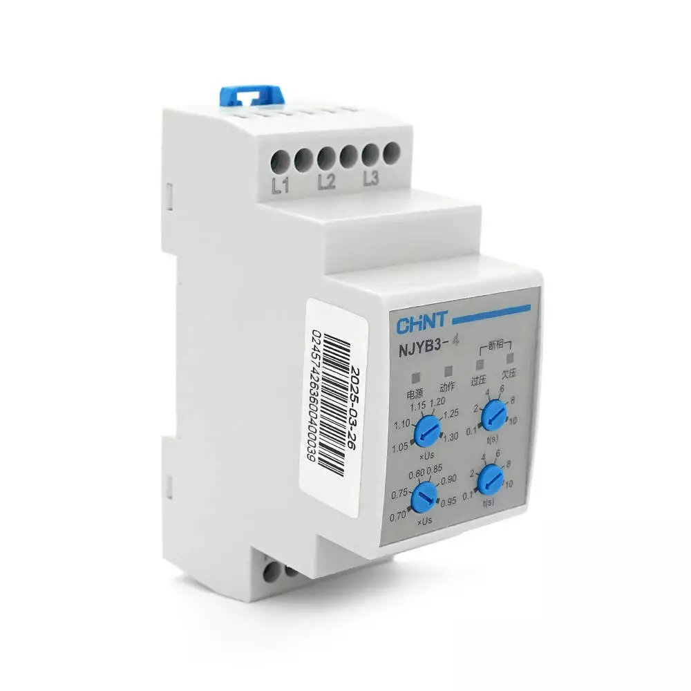 Реле контролю фаз CHINT NJYB3-4 AC380V, 3F3P, Захист U+(1,05~1,3)*Us/U-(0,7~0,95)*Us,Затримка 0,1~10с,Захист обриву/послідовності фаз/баланс20%, Ue740. 1CO+1NO