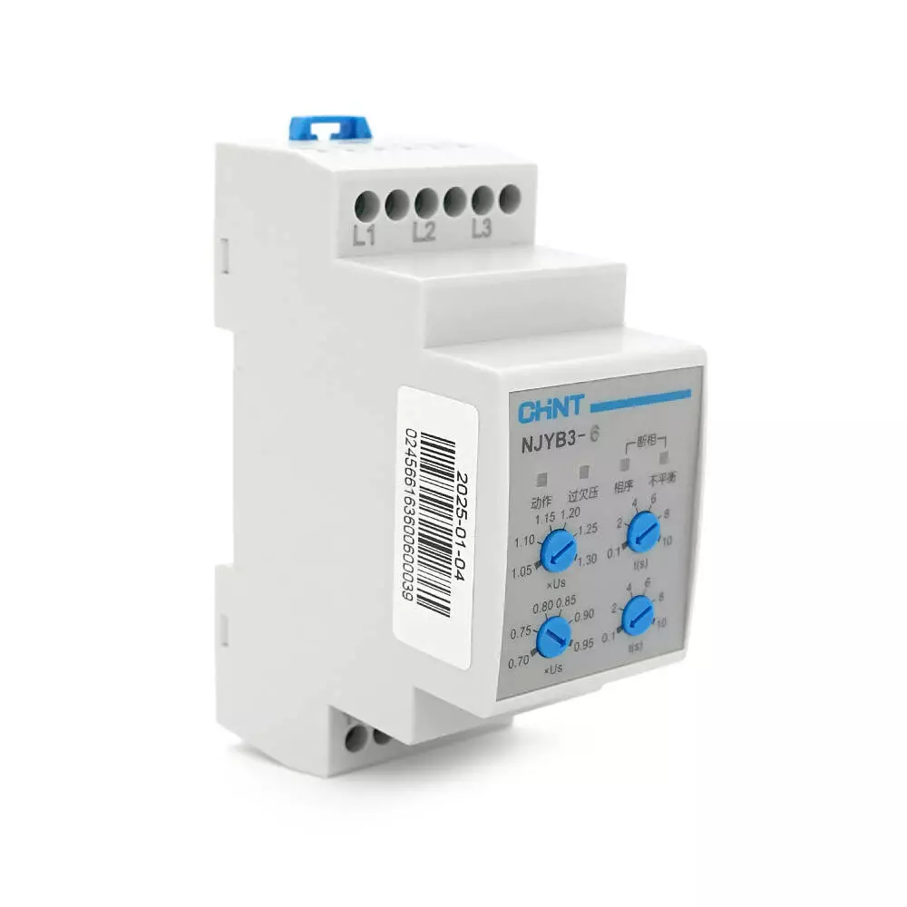 Реле контролю фаз CHINT NJYB3-6 AC380V, 3F3P, Захист U+(1,05~1,3)*Us/U-(0,7~0,95)*Us,Затримка 0,1~10с,Захист обриву/послідовності фаз/баланс20%, Ue240/415V, Ie0.75/0.47, 1CO+1NO