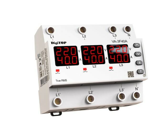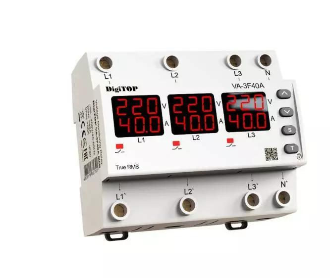 Реле напруги та струму дворежимне одно/трифазне VA-3F40A M6R на DIN-рейку, 3*40А, 3*8500Вт, 120-270В, шестимодульне з індикатором напруги
