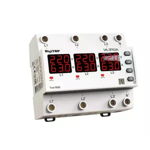 Реле напруги та струму дворежимне одно/трифазне VА-3F63А M6R на DIN-рейку, 3*63А, 3*13500Вт, 120-270В, шестимодульне з індикатором напруги (Червоний)