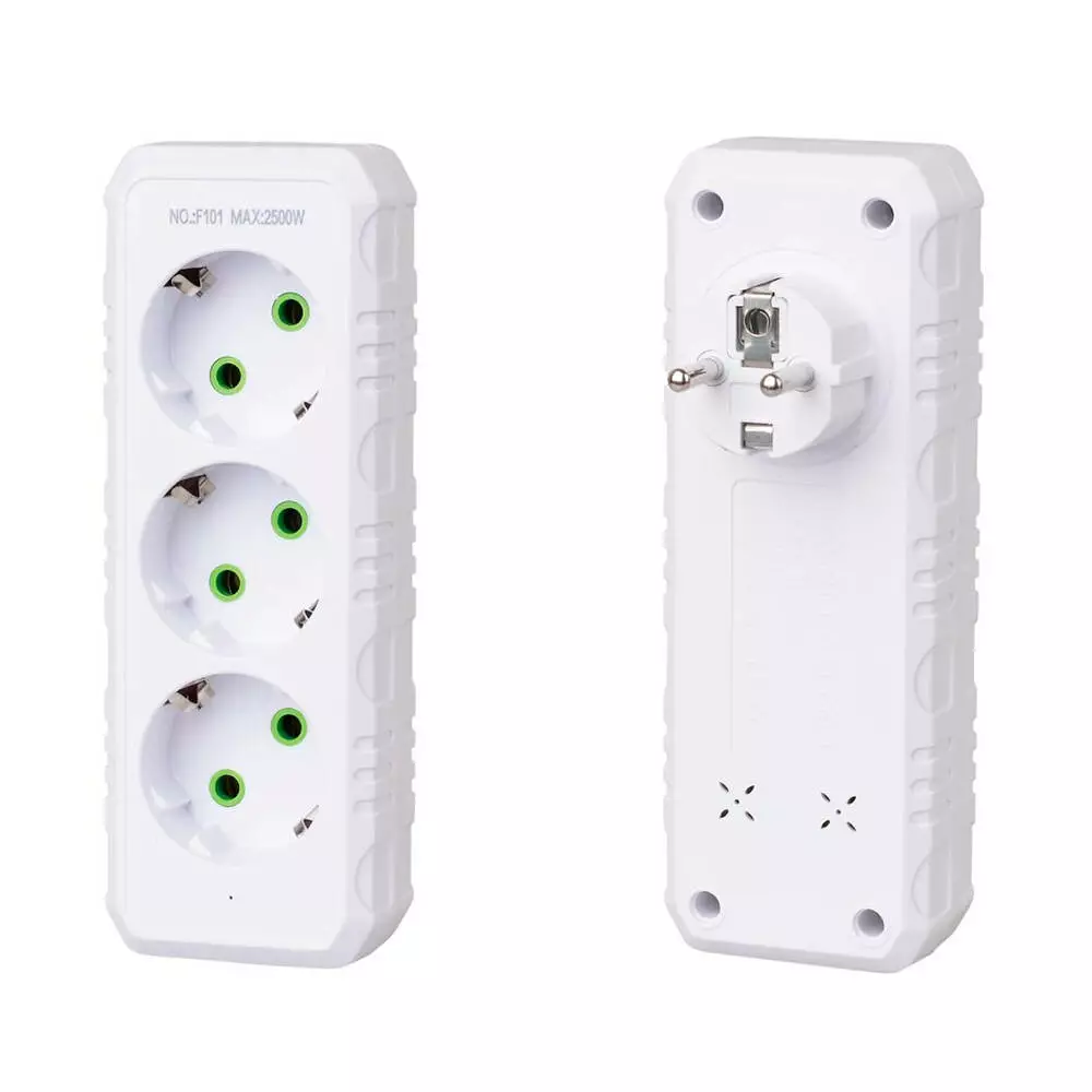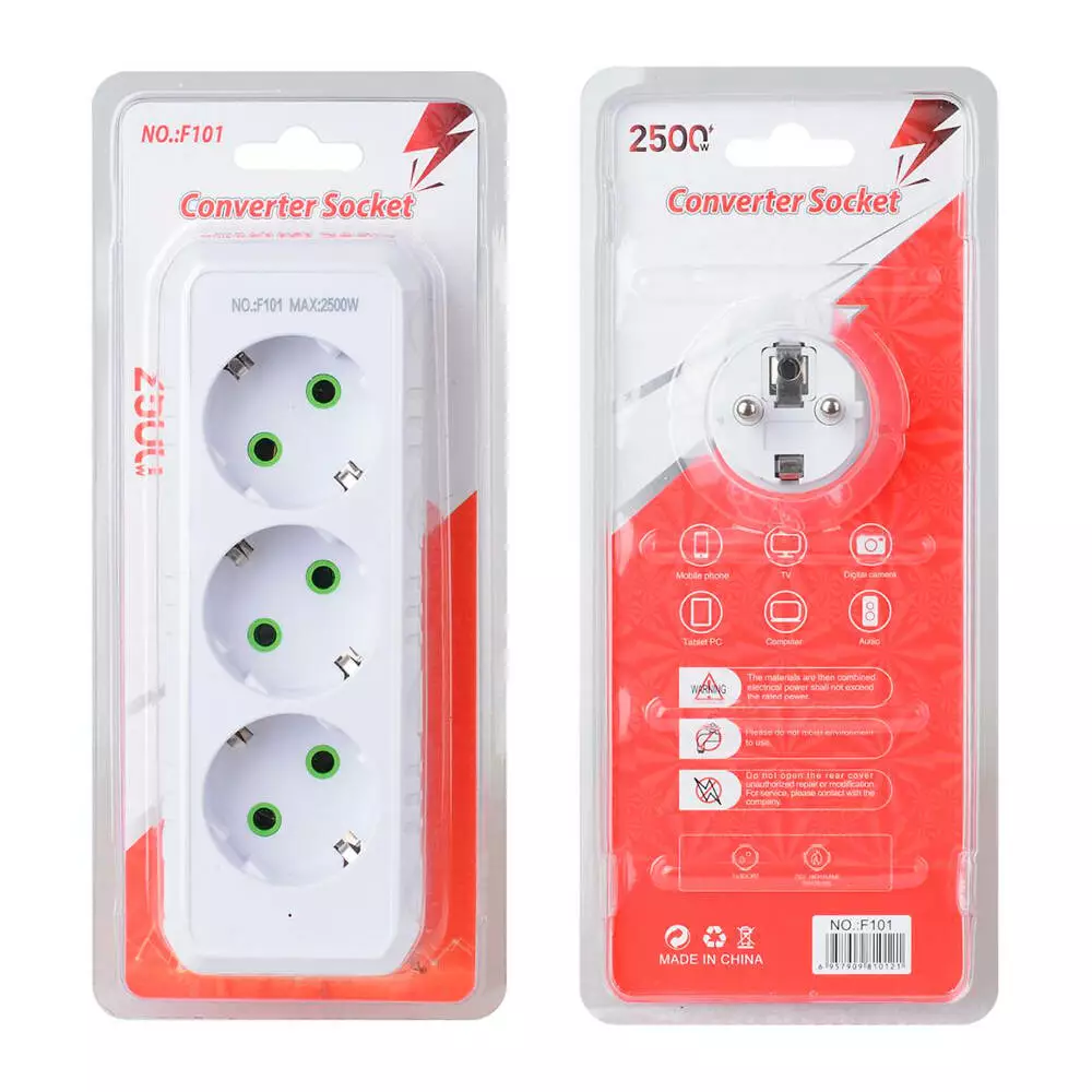 Розетка трійник із заземленням F101-White, 3 розетки, 2500W, 10A, 110-250V~Max, Blister