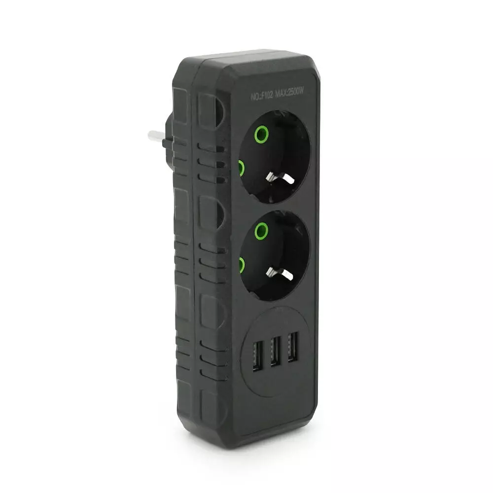 Розетка трійник із заземленням F102-Black, 2 розетки+3USB(1А), 2500W, 10A, 110-250V~Max, Blister