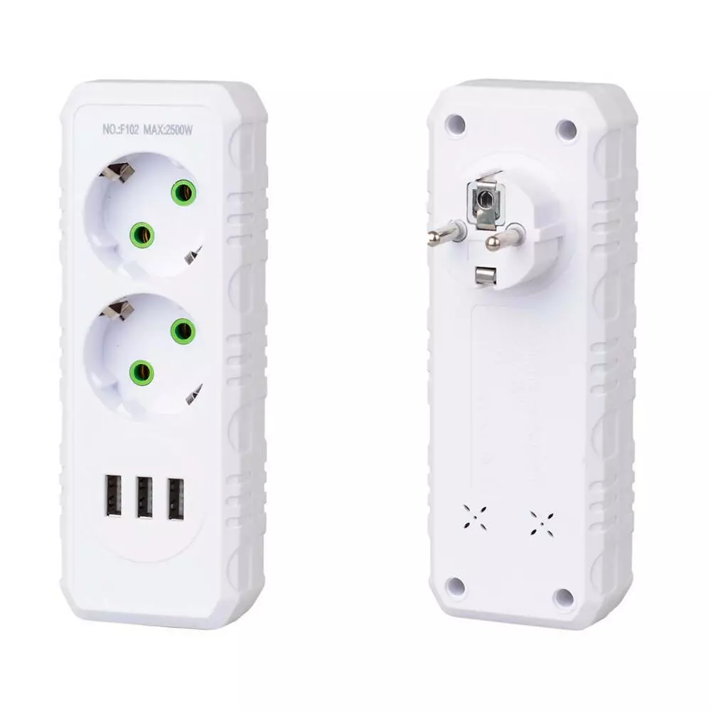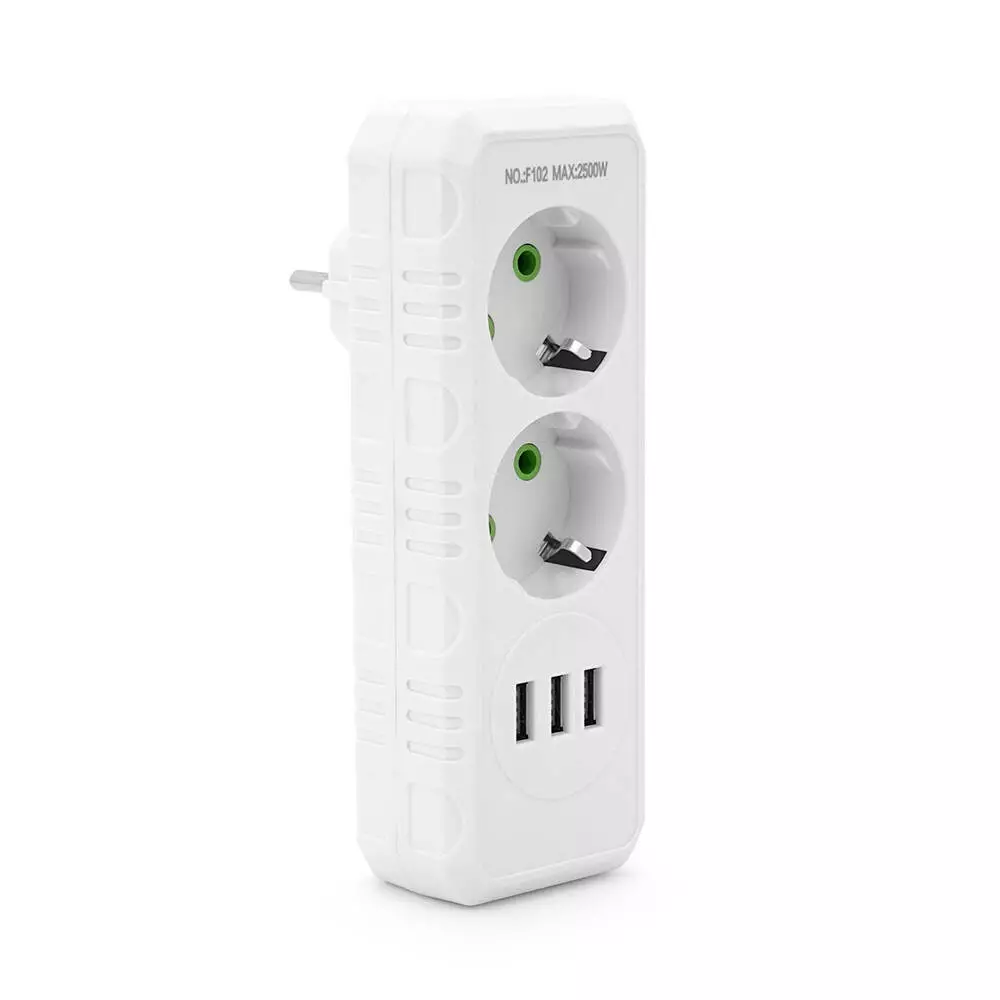 Розетка трійник із заземленням F102-White, 2 розетки+3USB(1А), 2500W, 10A, 110-250V~Max, Blister
