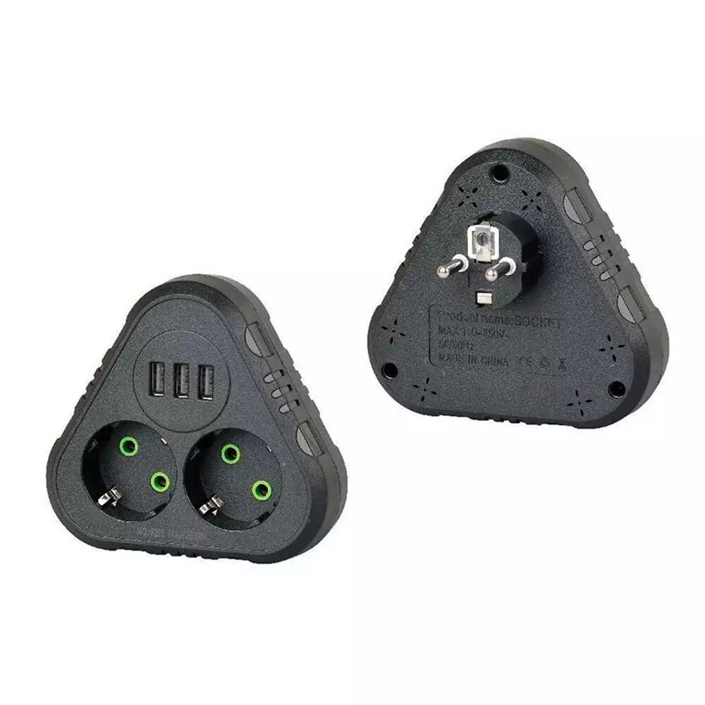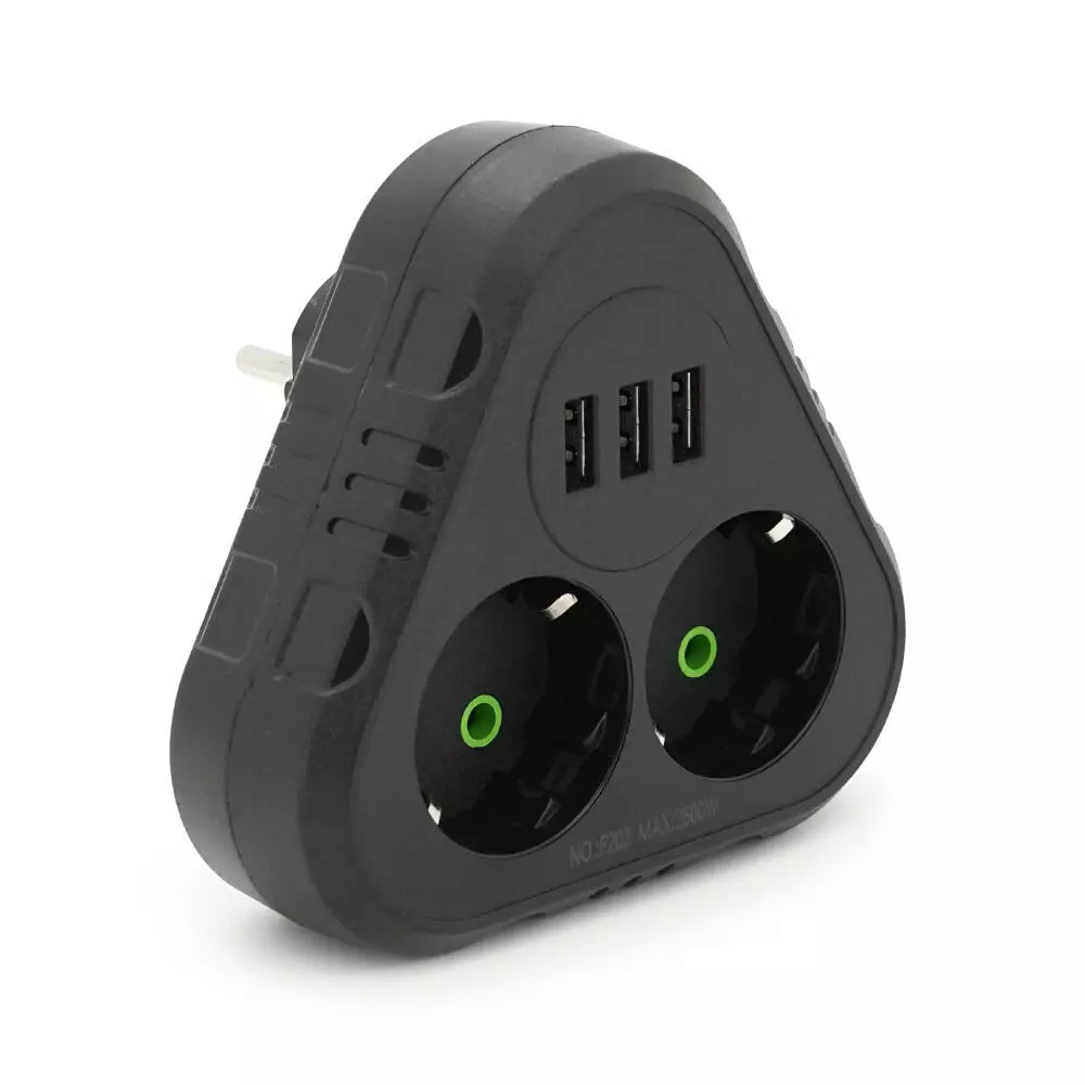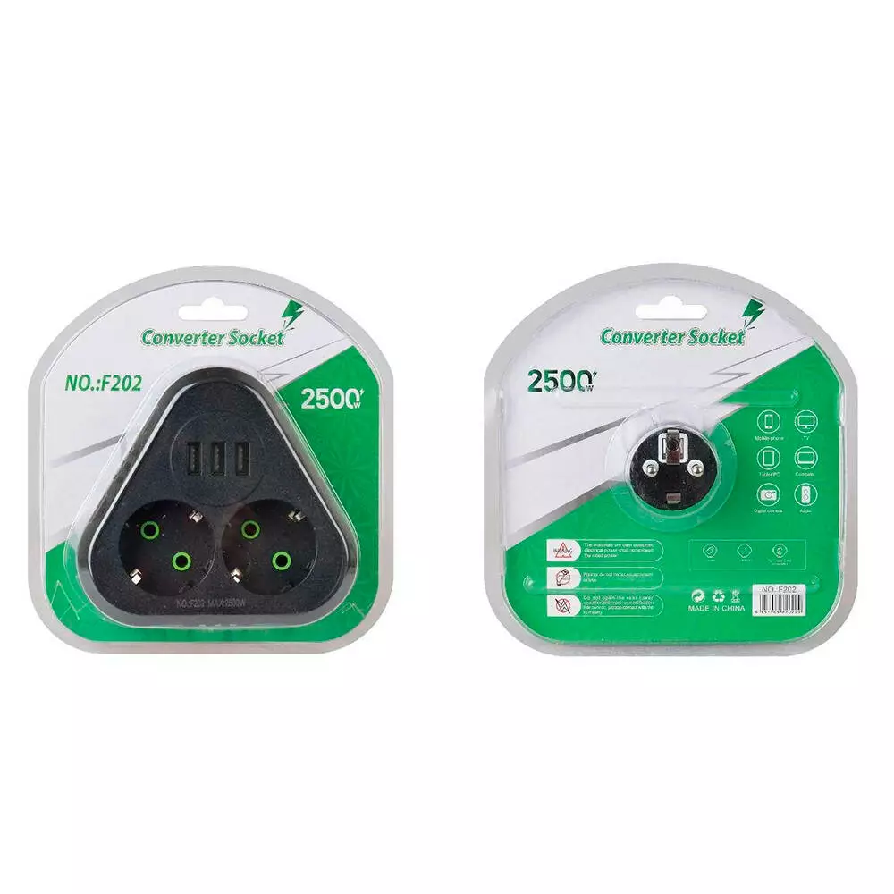 Розетка трійник із заземленням F202-Black, 2 розетки+3USB(1А), 2500W, 10A, 110-250V~Max, Blister