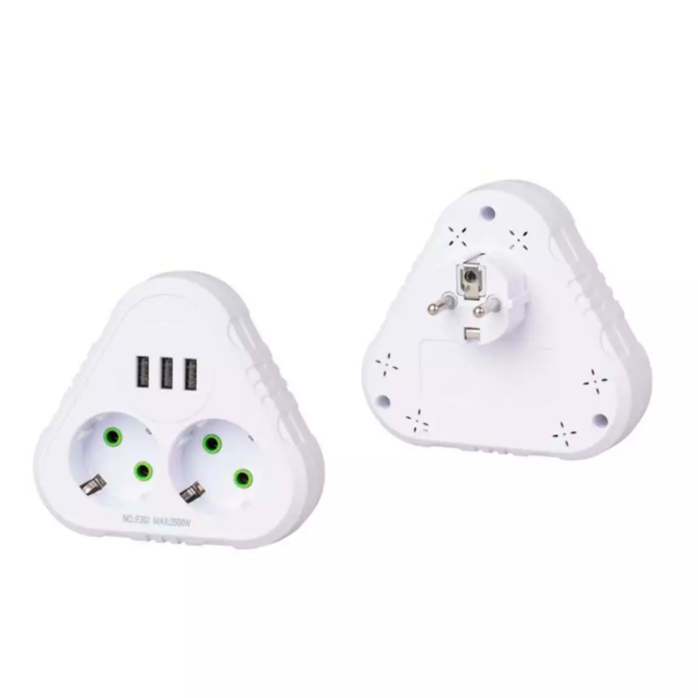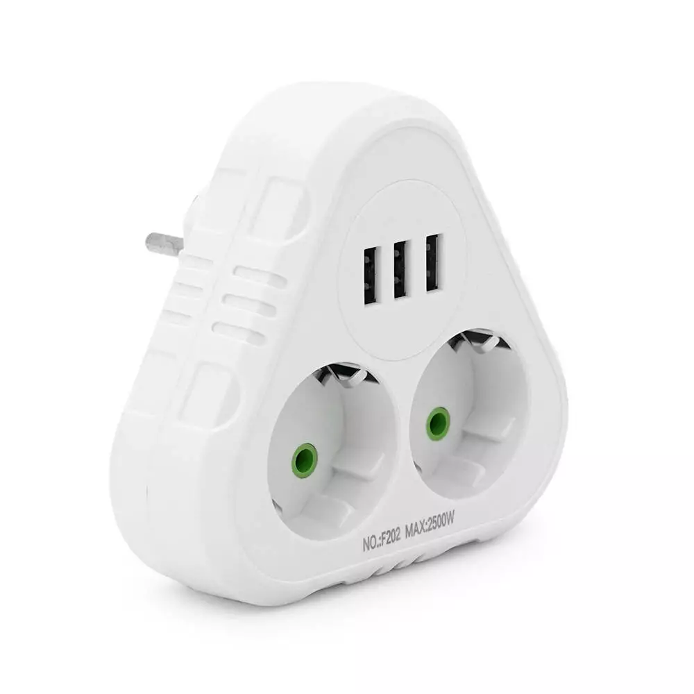 Розетка трійник із заземленням F202-White, 2 розетки+3USB(1А), 2500W, 10A, 110-250V~Max, Blister