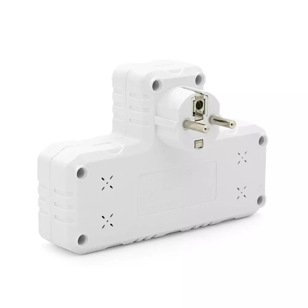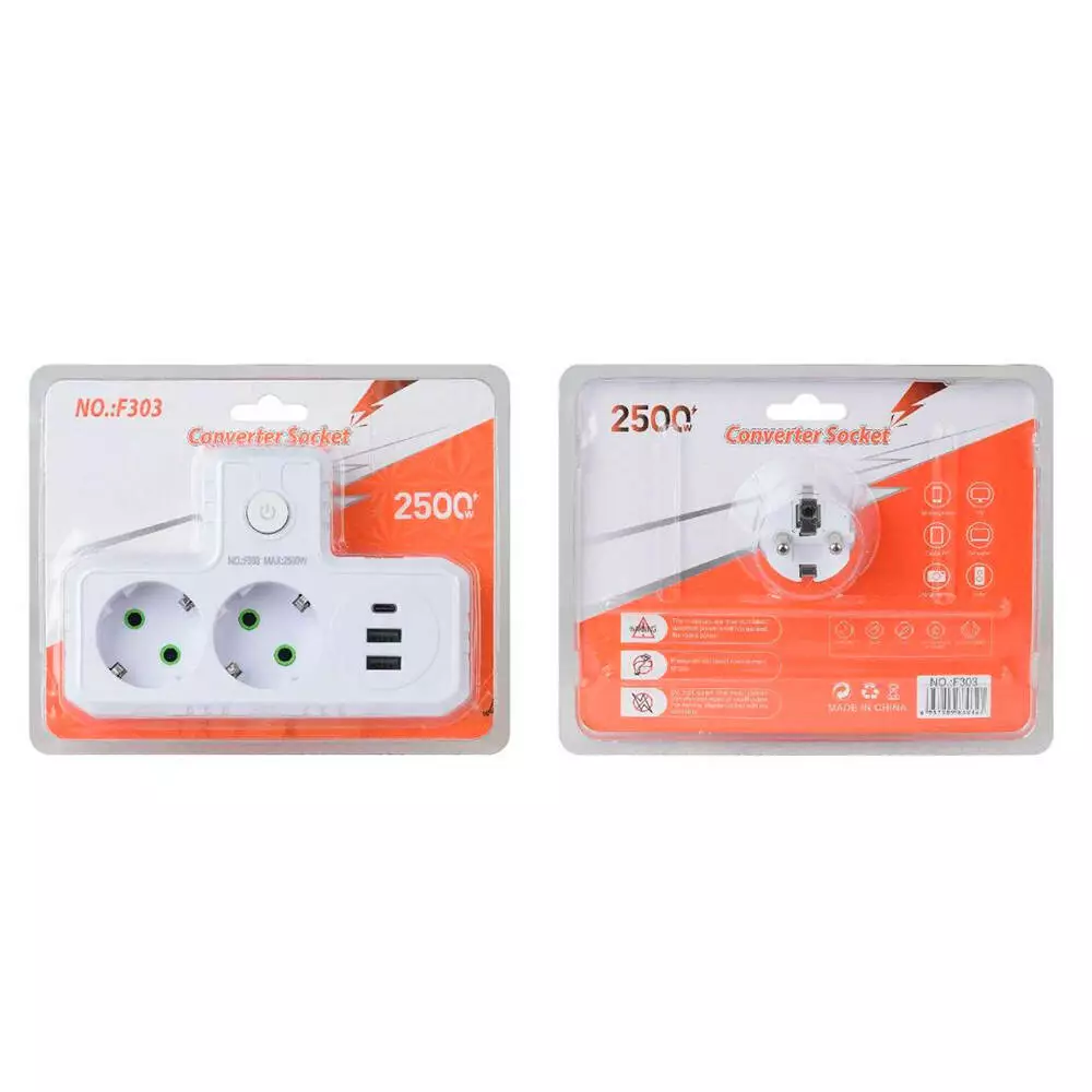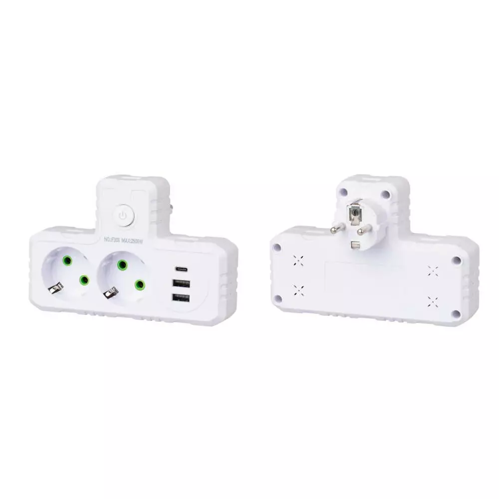 Розетка трійник Т-подібний із заземленням F303-White, 2 розетки+2USB+1Type-C, 2500W, 10A, 110-250V~Max, Blister