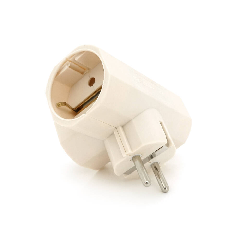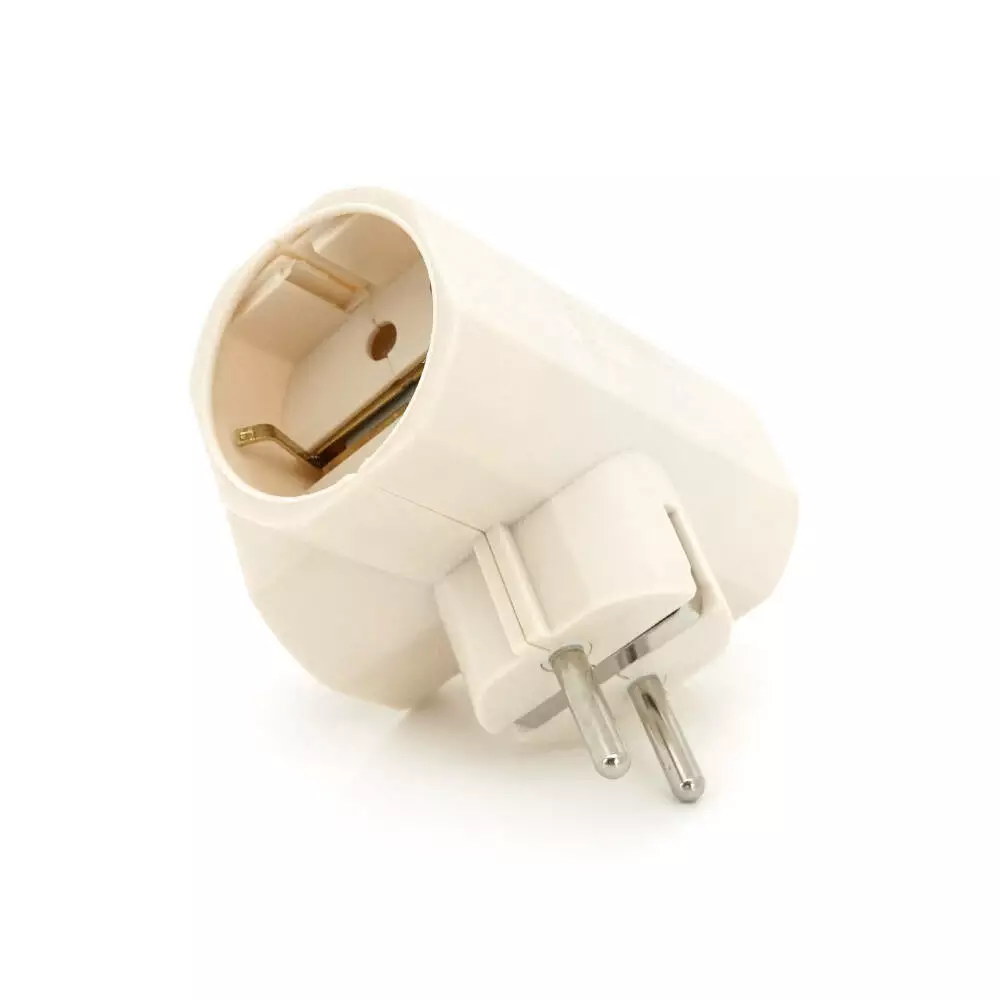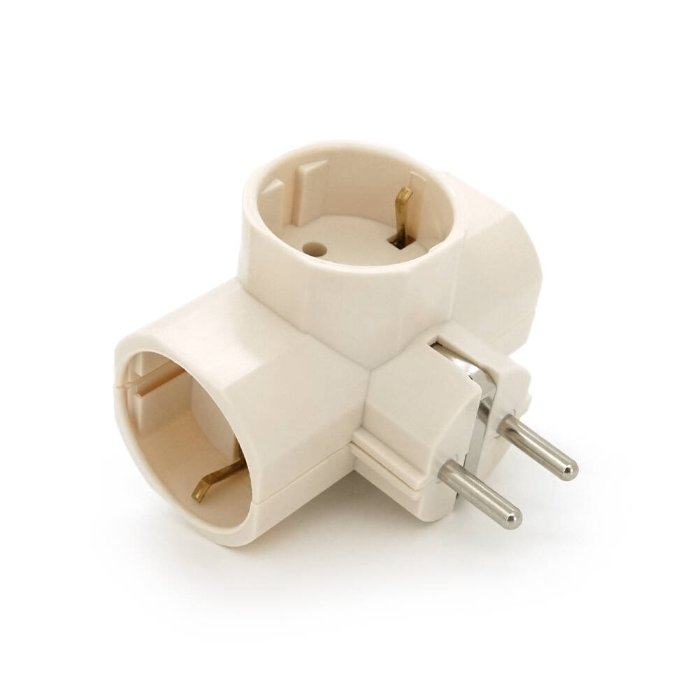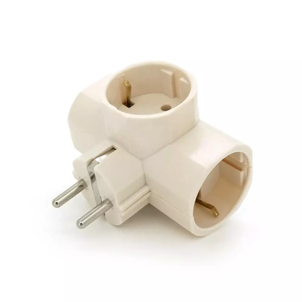 Цей товар є розеткою трійник із заземленням у вигляді Т-подібної конструкції, виконаної в білому кольорі.