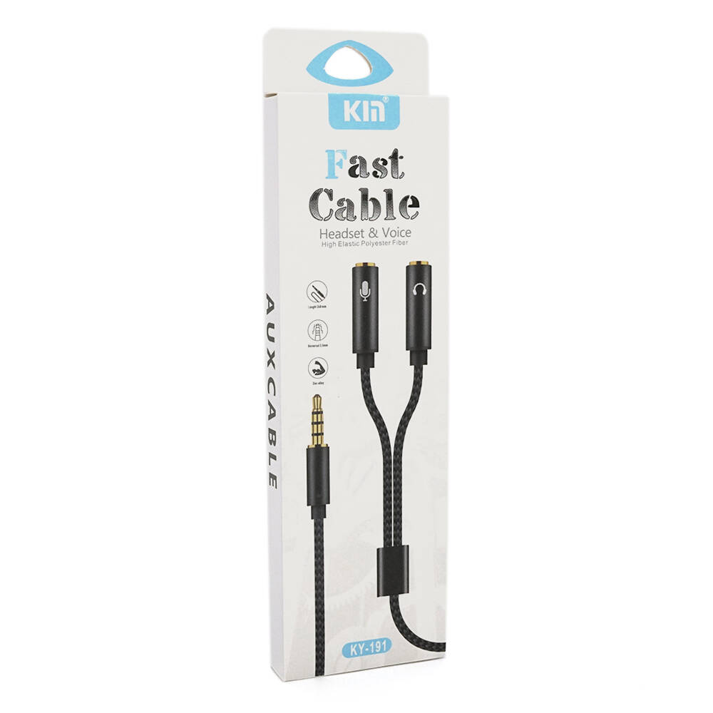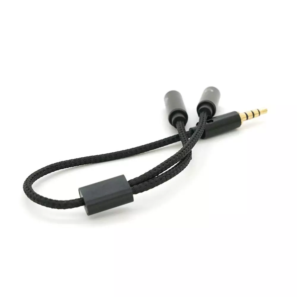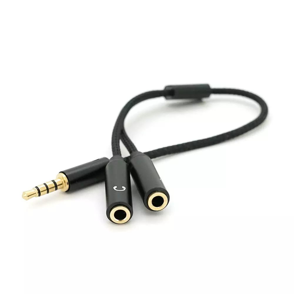 Розгалужувач аудіо для навушників та мікрофона Jack 3.5 (тато) 4 pin =>2*Jack 3.5(мама) 3 pin, круглий в обплетенні, Box