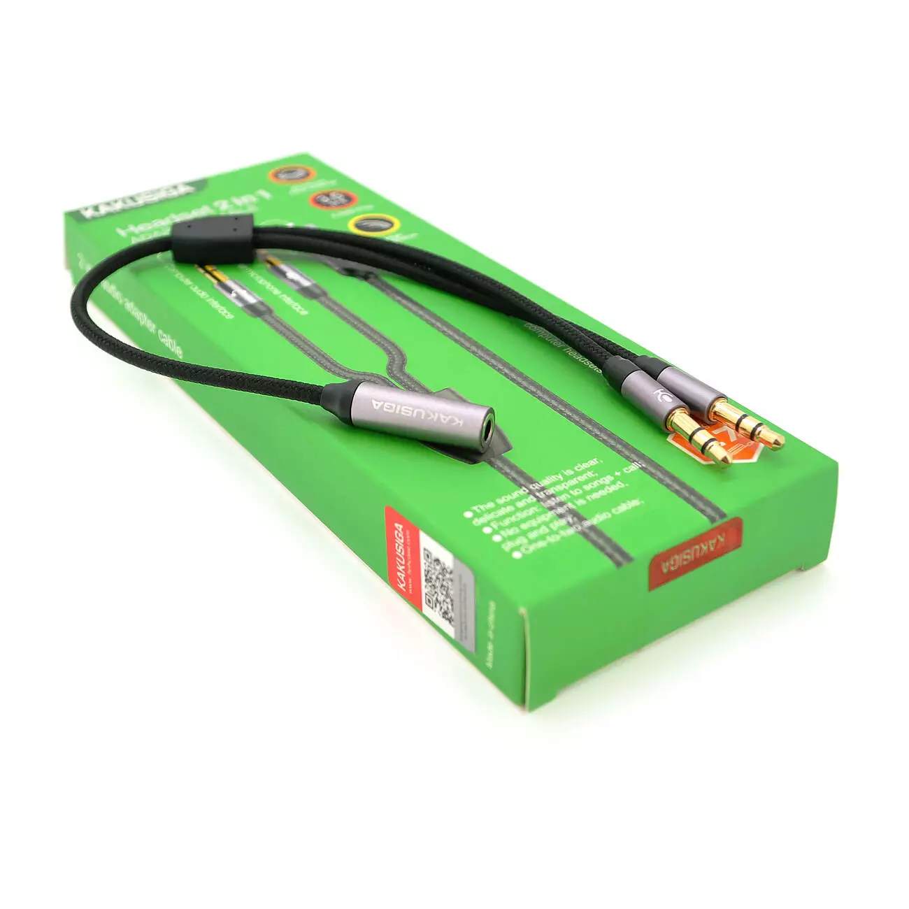 Розвиток аудіо iKAKU KSC-569 FEITENG призначений для підключення навушників та мікрофона до одного пристрою. Він має Jack 3.5 (мама) з 4 pin, котрий розгалужується на 2 Jack 3.5 (тато) з 3 pin кожний. Розвиток поставляється у круглій коробці.