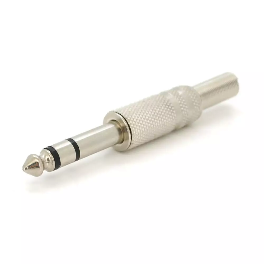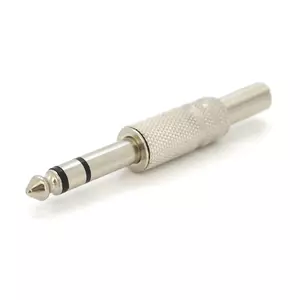 Таким чином, це роз'єм стерео 6,3 мм з рифленою текстурою, обладнаний пружиною для фіксації кабелю, виготовлений з сірого металу.