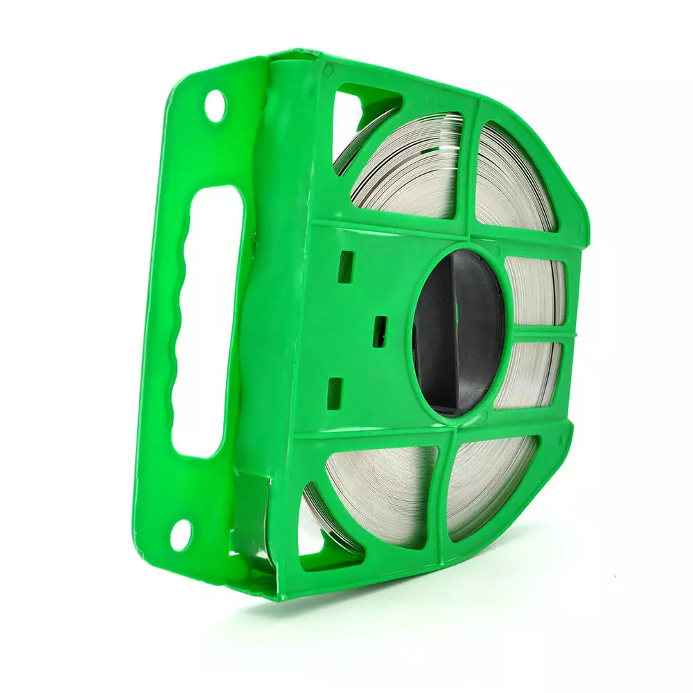 Виконана бандажна стрічка з нержавіючої сталі, але при цьому вона залишається гнучкою, міцною та зручною у використанні. Поставляється у захисній касеті, що сприяє компактному зберіганню