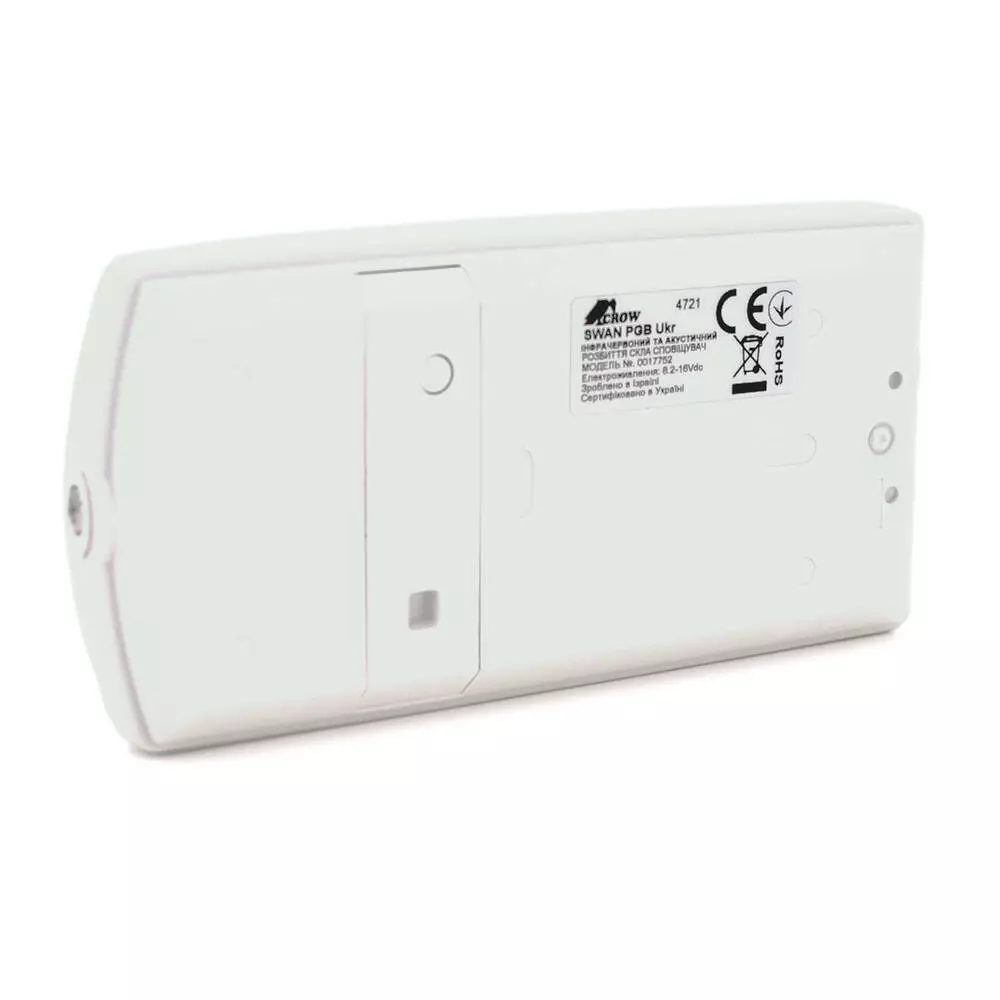 Друга складова датчика Crow SWAN PGB – датчик розбиття скла. Як і в окремих датчиків розбиття скла компанії Crow – Crow GBD-2 та Crow GBD Plus – робота датчика заснована на принципі звукової детекції та двоканального фазочастотного поділу. Для успішного спрацьовування датчика необхідно, щоб він спочатку вловив звук удару на низькій частоті і після цього - звук скла, що руйнується. При надходженні лише одного з цих сигналів датчик фіксує, але не передає тривогу на централь.