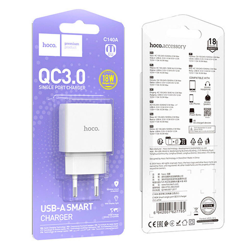 СЗУ 110-240V HOCO C140A 1xUSB, 18W, White, Blister