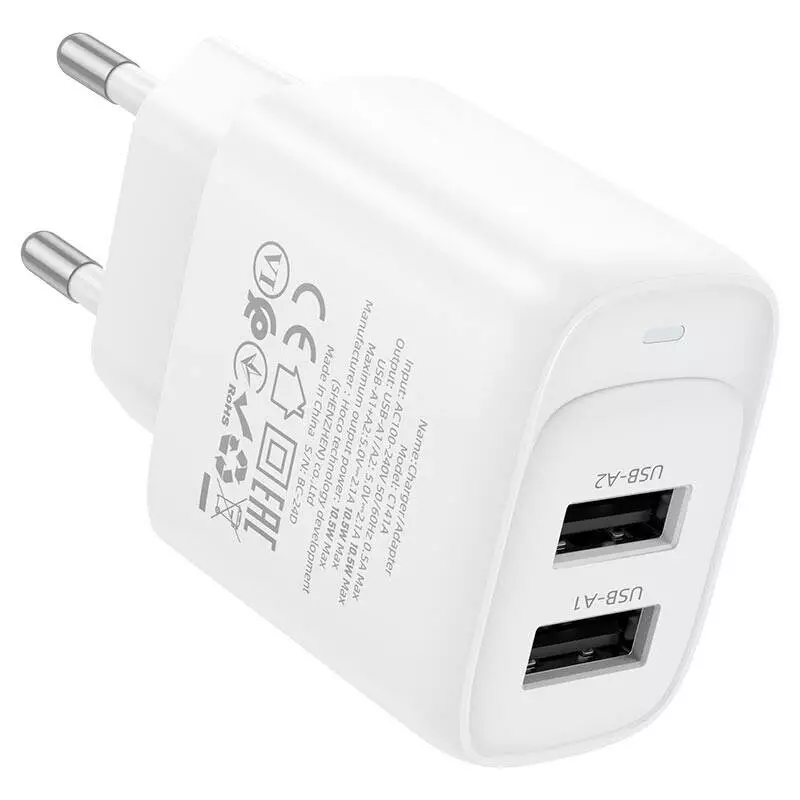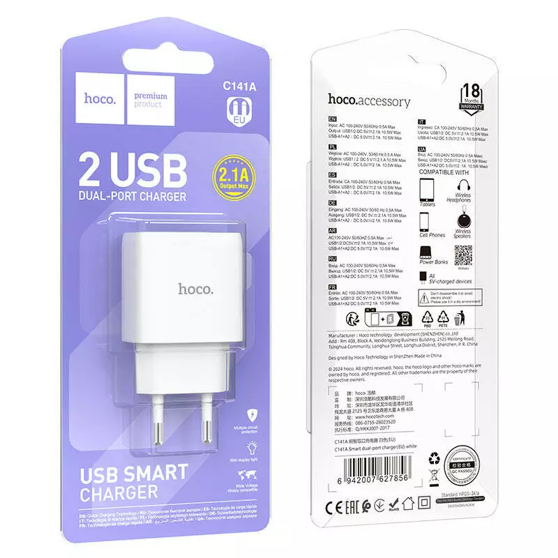 СЗУ 110-240V HOCO C141A 2xUSB, 10.5W, White, Box
